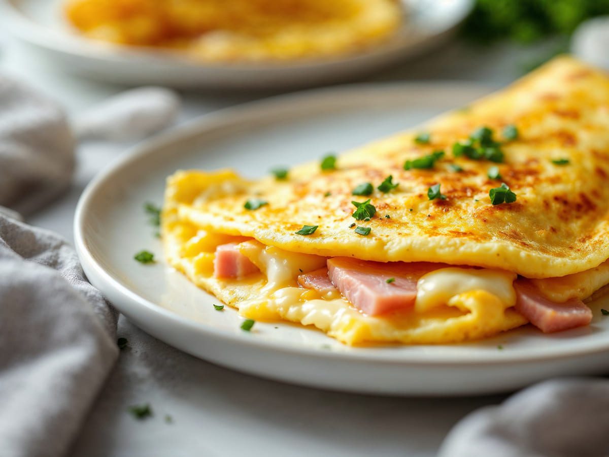 [IMAGEM: Foto de um omelete dourado e dobrado no prato, talvez com um pedacinho de queijo derretido aparecendo]